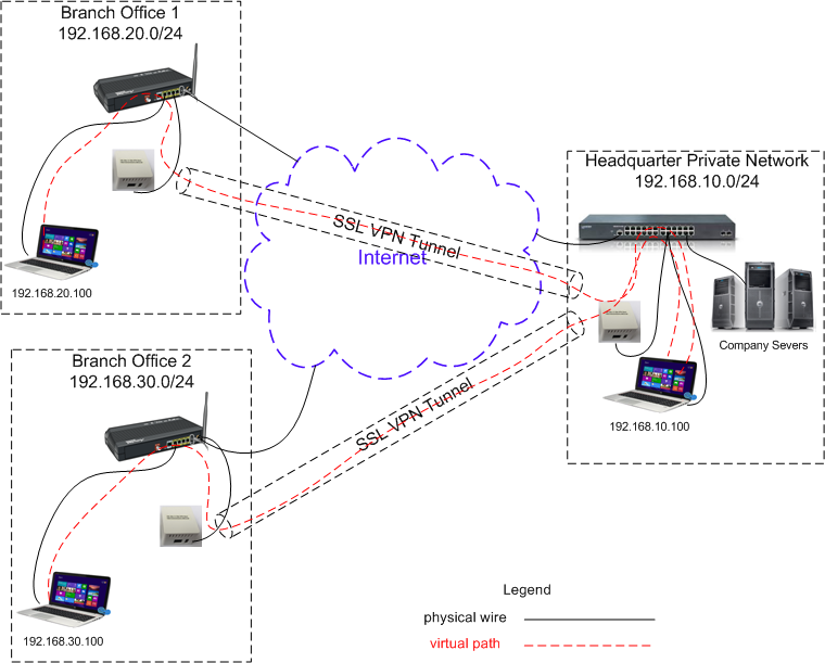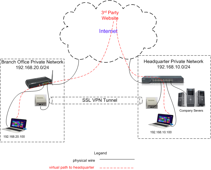 Bandwidth Efficient: PCs on each network still use their own uplink to access internet. On traffic to main/branch office is going through SSL/TLS VPN tunnel. this way, the internet resource is efficiently used.