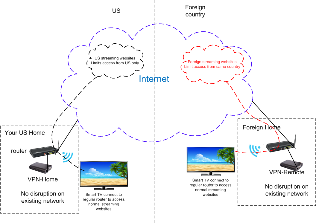 This VPN-twin product does not disrupt your existing network. When John wants to access US entertainment, he can simply connect his TV/PC to his regular home router to do that. (see figure below).
