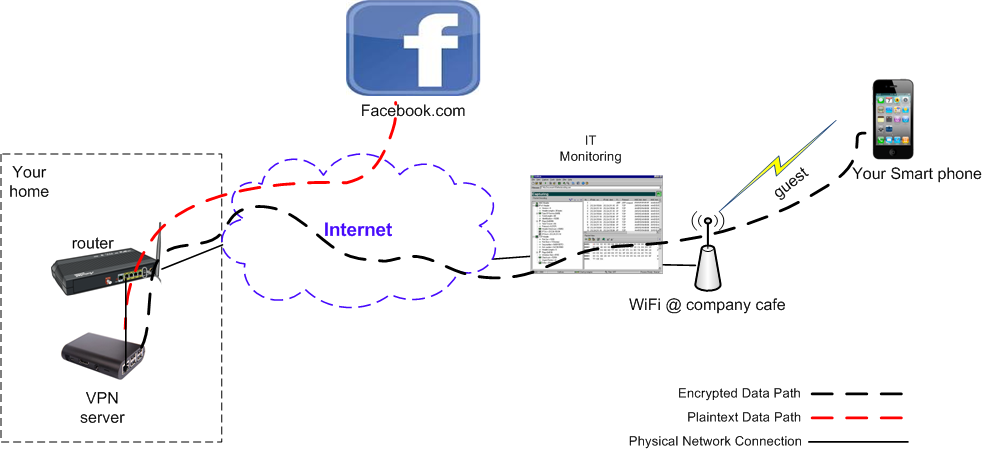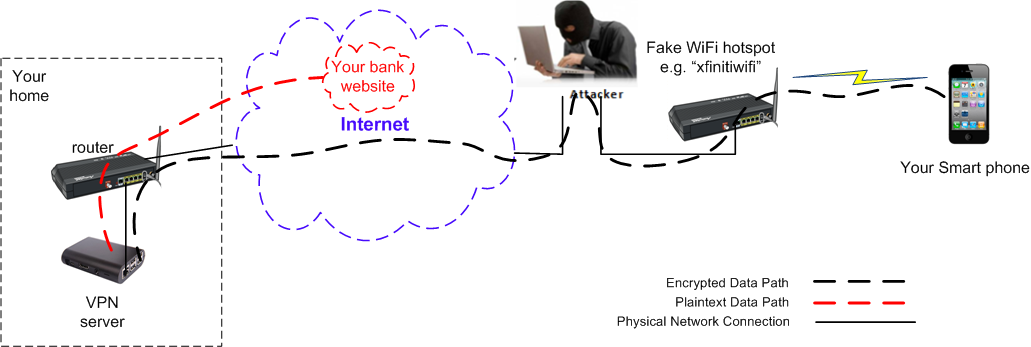With this VPN server device , you are worry-free. After VPN tunnel created between your smartphone and VPN server, all your online activities are encrypted between your smart phone and VPN server at your home. That means, any man in the middle (i.e. hackers at WiFi hotspots) cannot see what's in the packets. If any packet is modified by hackers, the packet integrity check failure would detected by VPN tunnel, therefore discarded. This eliminates any man-in-the-middle attack.