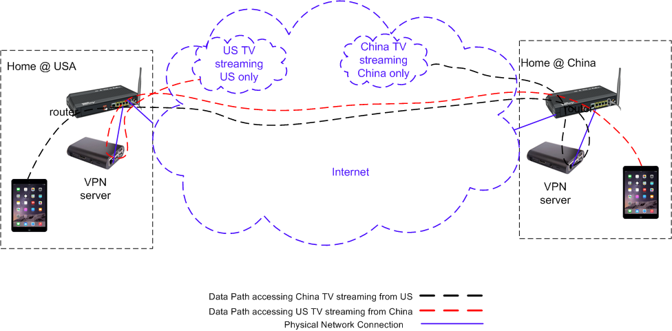 In this example, visitors from China can use iPad to connect to VPN server at home in China. This way, he/she can access the China TV streaming that limits access only from within China. The VPN server makes the iPad from US appear from within China. Also, in same way, his/her family in China can access US entertainment streaming that limits access only from within US.